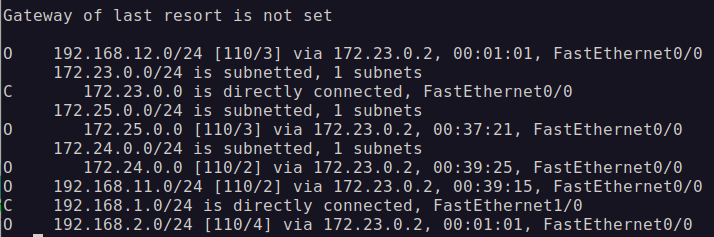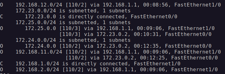 Por ejemplo, en la tabla de enrutamiento del router R1 las rutas a las redes 172.23.0.0/24 y 192.168.1.0/24 está marcadas como conectadas. El resto de destinos se descubren y añaden a la tabla de enrutamiento gracias al protocolo OSPF. Todas las rutas que no están conectadas directamente a este dispositivo muestran una distancia administrativa por defecto de 110. Mientras que algunas de ellas cuentan con 2 saltos, otras requieren tres para llegar al destino. Además, en varios casos como ocurre con la red 172.25.0.0/24 o la 192.168.11.0/24 la tabla de enrutamiento de este router recoge dos opciones diferentes para llegar al mismo destino con diferente latencia.