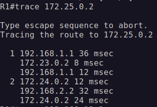 Si se traza la ruta desde R1 hasta la interfaz f1/1 del router R4, el router R1 devuelve dos posibles caminos: a través del router R2 (172.23.0.2 y 172.24.0.2) o a través del router R5 (192.168.1.1 y 192.168.2.2).