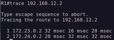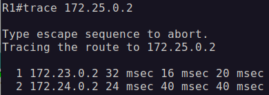 Esa misma es la ruta que elige para llegar a la interfaz f1/1 de R4 (172.25.0.2), que está directamente conectada al router R3. En este caso, a diferencia del ejemplo anterior en el que había dos opciones posibles para hacer esta ruta, como R5 está apagado, el análisis del recorrido del mensaje con trace siempre muestra la única ruta disponible.